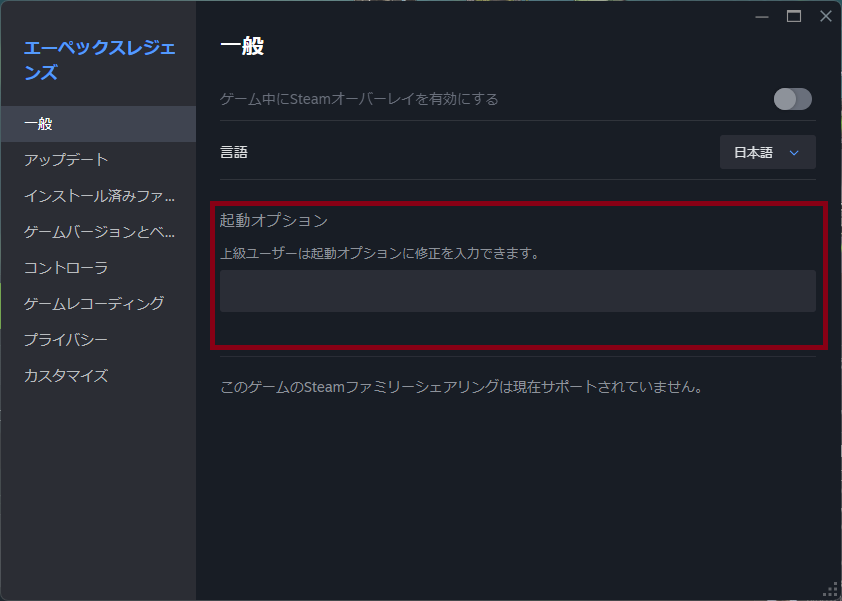 ライブラリ→APEX LEGENDS→管理(歯車マーク)→プロパティ→一般→起動オプション