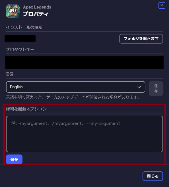 ライブラリ→APEX LEGENDS→管理(歯車マーク)→プロパティを表示する→詳細な起動オプション