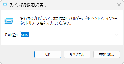 Win+R」キーを押し、「cmd」と入力したら、「Ctrl+Shift+Enter」キーを押し、管理者としてコマンドプロンプトを起動します。