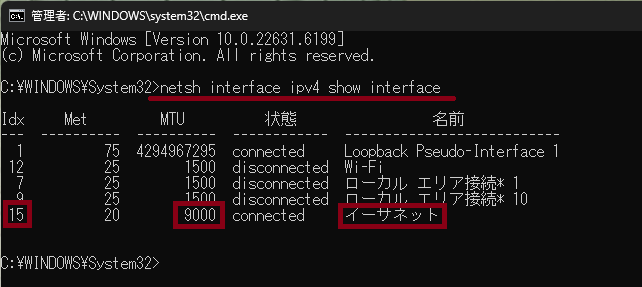 表示された項目の中から「イーサネット」の行を探し、「Idx」の番号と現在の「MTU」の値を確認してください。