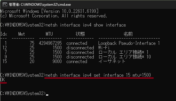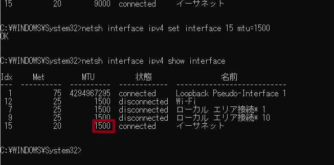 netsh interface ipv4 set interface (確認したIdx番号) mtu=(調べたMTUの値)
