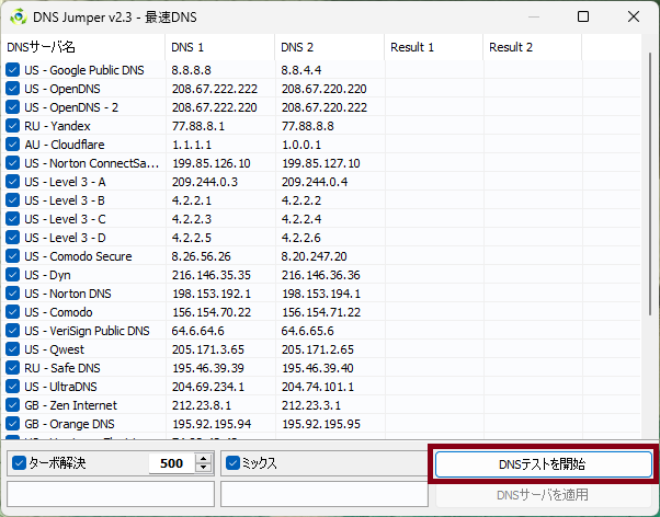 DNSテストを開始」を押してしばらく待ちます。