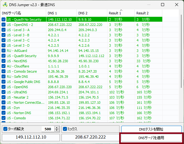 最も速かったサーバーが選出されたのを確認し、「DNSサーバーを適用」を押して閉じます。