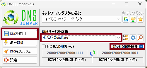 もしIPv6のDNSも変更したい場合は、「IPv6 DNSを使用」にチェックを入れ、サーバー選択から「4.AU – Cloudflare」等を選んで「DNSを適用」を押してください。