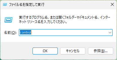 Win+R」キーを押し、「control」と入力したら、OKを押してコントロールパネルを起動します。