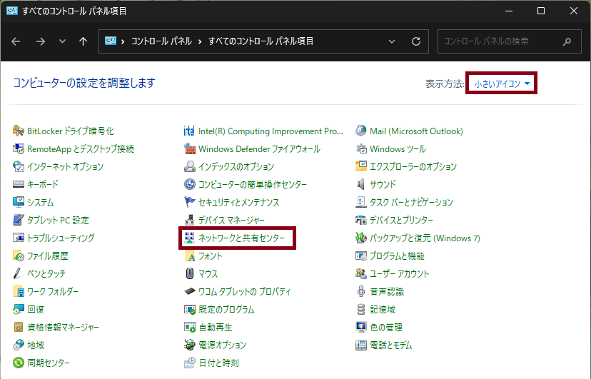 コントロールパネル」を起動したら、表示方法を「小さなアイコン」にし「ネットワークと共有センター」を選択します。