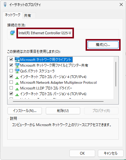 イーサネットのプロパティ」で画像赤枠内の項目を設定します