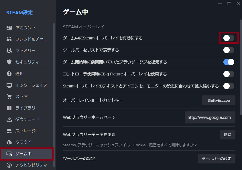3. 「ゲーム中にSteamオーバーレイを有効にする」をオフ