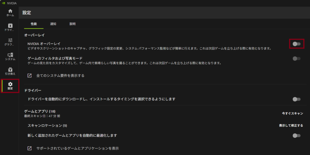 PCのスペックが足りているのに動作が安定しない場合、「オーバーレイ機能」が干渉している可能性があります。