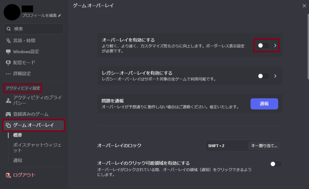 2. 左メニューの「アクティビティ設定」>「ゲームオーバーレイ」を選択。