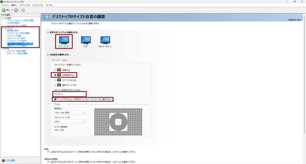 NVIDIAコントロールパネルのデスクトップのサイズと位置の調整を選択